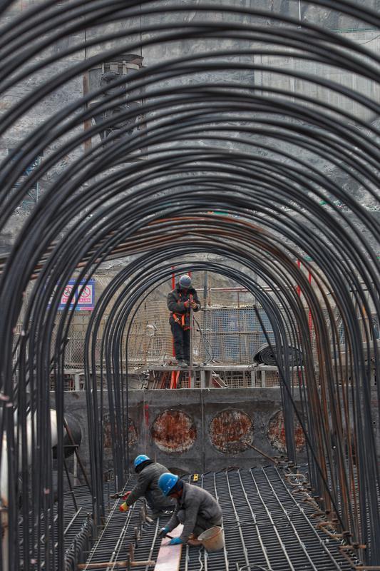 2月2日,在东庄水利枢纽工程施工现场,建筑工人正在绑扎钢筋。