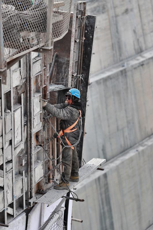 2月2日,在东庄水利枢纽工程施工现场,建筑工人正在进行大坝模板安装。