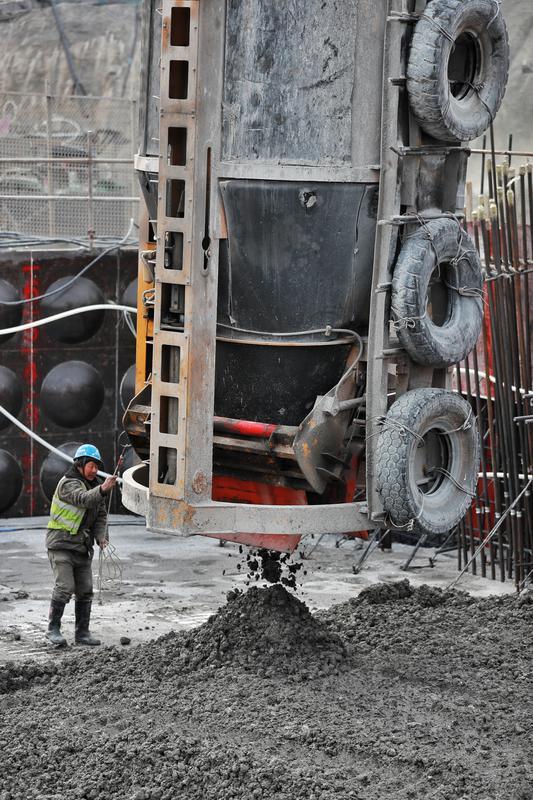 2月2日,在东庄水利枢纽工程施工现场,建筑工人正在进行混凝土卸料。
