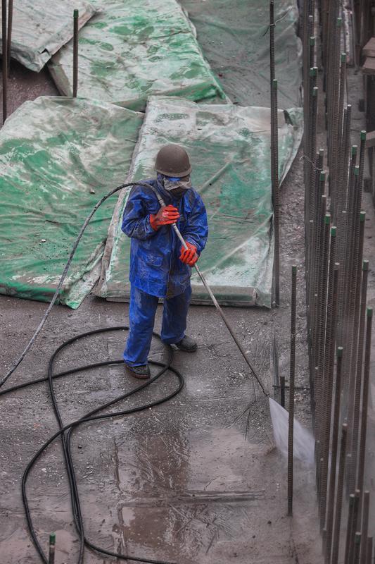 2月2日,在东庄水利枢纽工程施工现场,建筑工人正在进行混凝土冲毛工序。