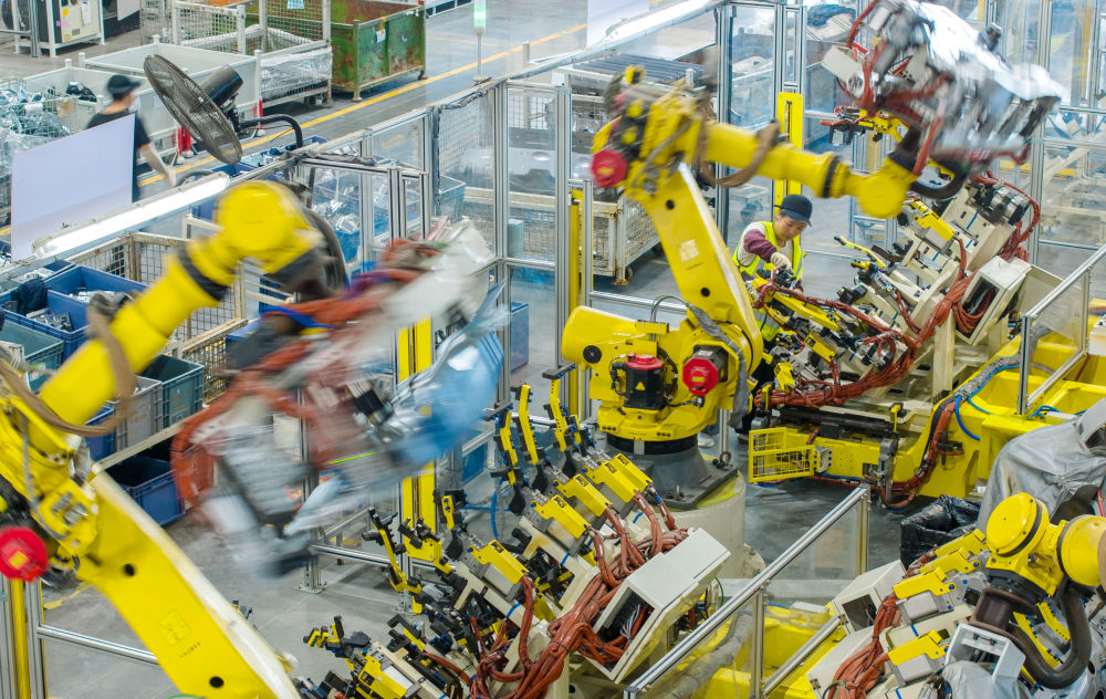 浙江省湖州市长兴经济技术开发区的长兴地通汽车部件有限公司技术人员操控工业机器人生产新能源汽车配件(无人机照片,2025年10月9日摄)。