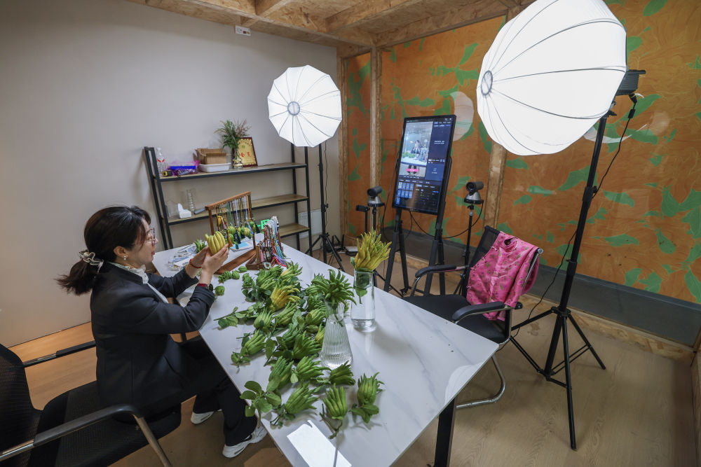 在浙江金华市金东区赤松镇北山口村的金华佛手农林服务中心内的直播间,工作人员进行佛手鲜果及衍生产品的直播销售(2025年10月22日摄)。