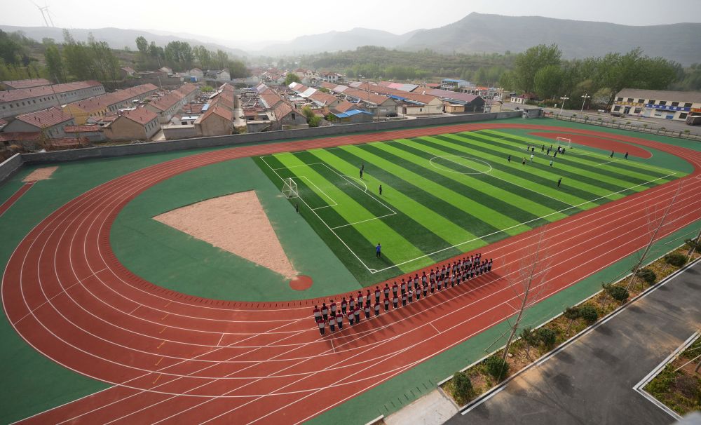 在位于山东潍坊市临朐县石家河村的临朐县弥水教育集团石家河校区,学生在操场塑胶跑道上进行体育锻炼(2025年4月17日摄)。